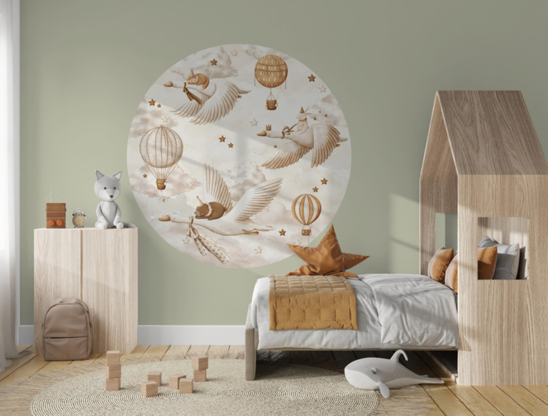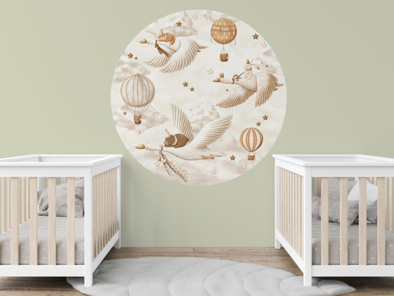 Breng een dromerige en rustige sfeer in de baby- of kinderkamer met deze prachtige muurcirkel “Droomvlucht”. Het zachte design toont vliegende ganzen tussen wolken, sterren en luchtballonnen, vergezeld door schattige dieren in beige tinten. De rustige kleuren en sprookjesachtige illustraties maken deze muurcirkel perfect voor een serene en stijlvolle babykamer of kinderkamer.
