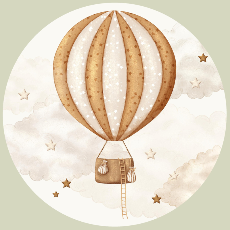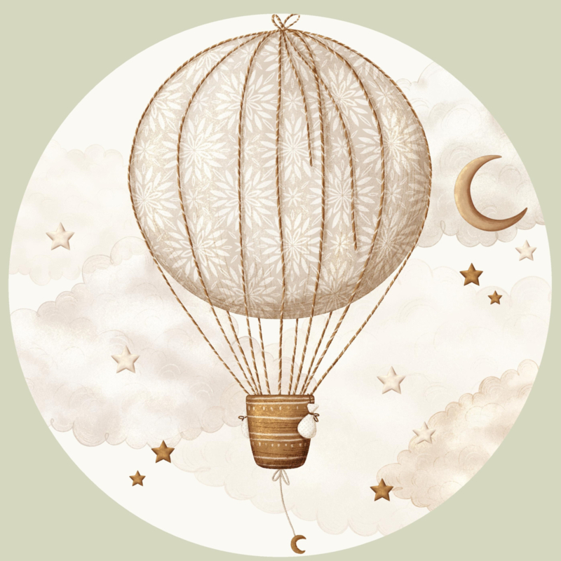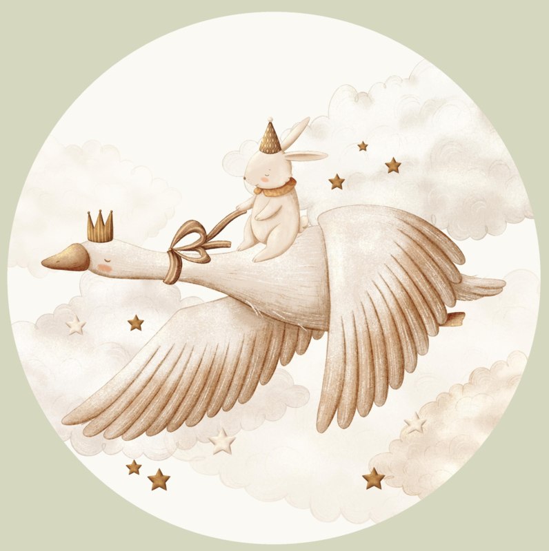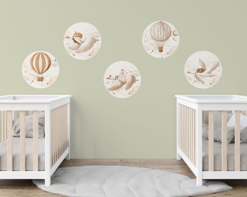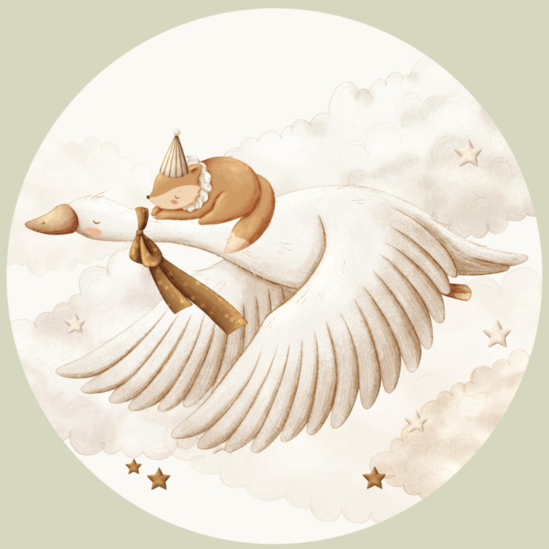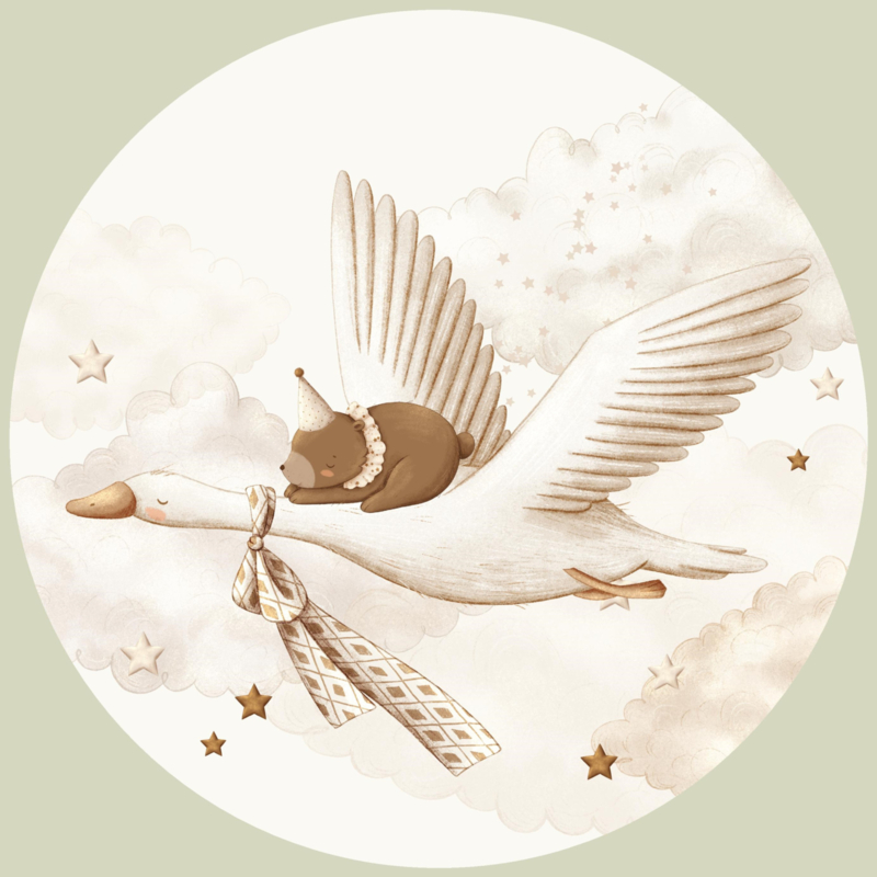 Breng een dromerige en rustige sfeer in de baby- of kinderkamer met deze prachtige muurcirkel set Droomvlucht. Het zachte design toont vliegende ganzen tussen wolken, sterren en luchtballonnen, vergezeld door schattige dieren inbeige tinten. De rustige kleuren en sprookjesachtige illustraties maken deze muurcirkel perfect voor een serene en stijlvolle baby - kinderkamer.