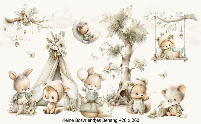 Kleine Bosvriendjes is een sfeervol kinderbehang met lieve bosdieren in zachte, natuurlijke tinten. Dit behang is perfect voor de babykamer of kinderkamer en creëert een rustige, warme uitstraling waarin je kindje zich veilig en geborgen voelt.