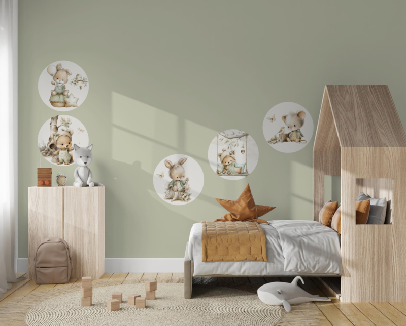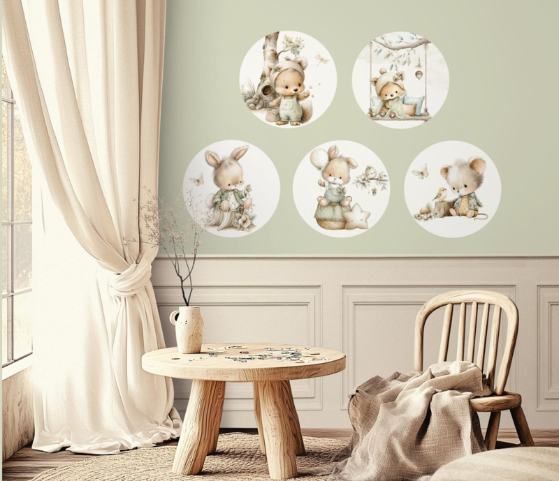 Kleine Bosvriendjes is een sfeervolle muurcirkel set met lieve bosdieren in zachte, natuurlijke tinten. Deze muurcirkel set is perfect voor de babykamer of kinderkamer en creëert een rustige, warme uitstraling waarin je kindje zich veilig en geborgen voelt. De muurcirkels hebben ieder een diameter van 30 cm. De muurcirkels zijn eenvoudig te bevestigen en kunnen flexibel worden opgehangen om een unieke compositie te maken.