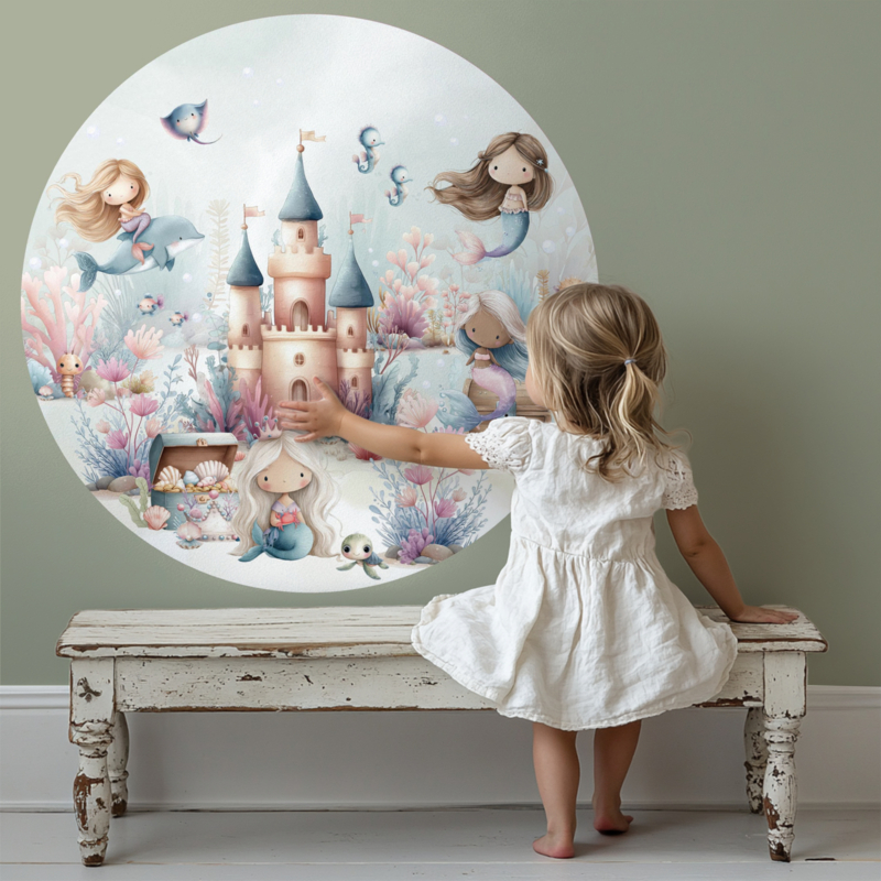 Breng een vleugje magie in de kinderkamer met deze betoverende muurcirkel vol zeemeerminnen en een sprookjesachtig onderwaterkasteel. De zachte pastelkleuren en lieve details creëren een rustige, dromerige sfeer waarin fantasie tot leven komt.