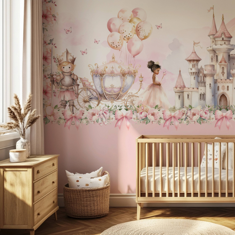 De roze lambrisering heeft een hoogte van 1.20 meter en zorgt voor een rustige basis, terwijl het bovenste gedeelte tot leven komt in het land van de prinsessen.