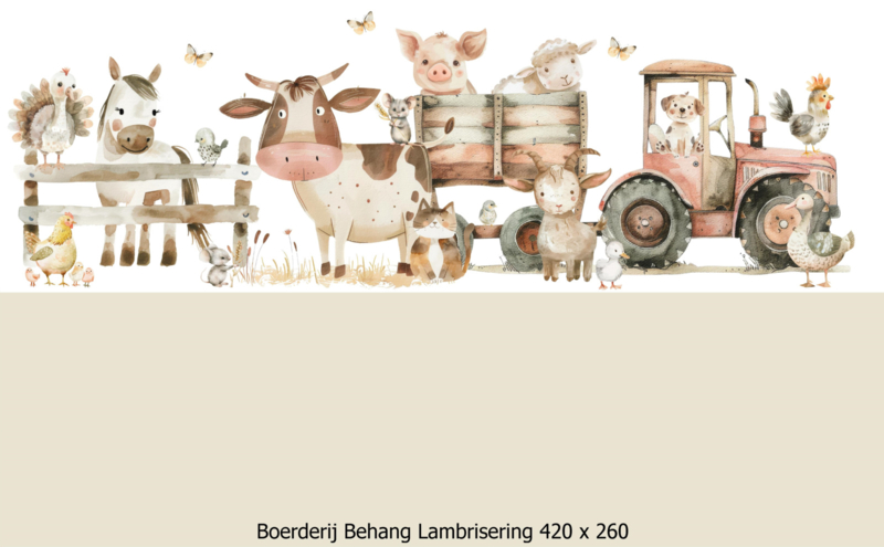 De naturel beige lambrisering heeft een hoogte van 1.20 meter en zorgt voor een rustige basis, terwijl het bovenste gedeelte tot leven komt met lieve boerderijdieren.