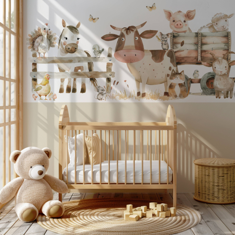 Breng de charme van het platteland naar de kinderkamer met dit unieke boerderij behang welke wij op maat voor je kunnen maken.