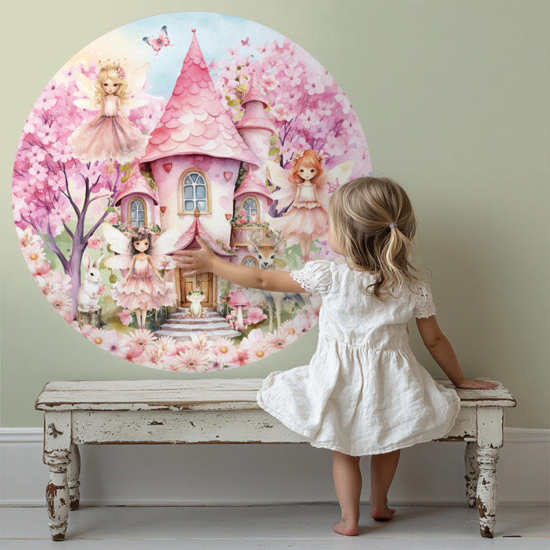 Breng de magie van een sprookjeswereld in huis met deze prachtige muurcirkel vol elfjes, bloesembomen en schattige dieren. Ontdek de betoverende details, van roze paddenstoelenhuisjes tot sierlijke elfjes met vleugels die stralen in een zacht palet van pastelkleuren. Perfect voor een kinderkamer of een creatieve ruimte waar dromen tot leven komen. Laat je meevoeren naar een wereld vol fantasie en verwondering!