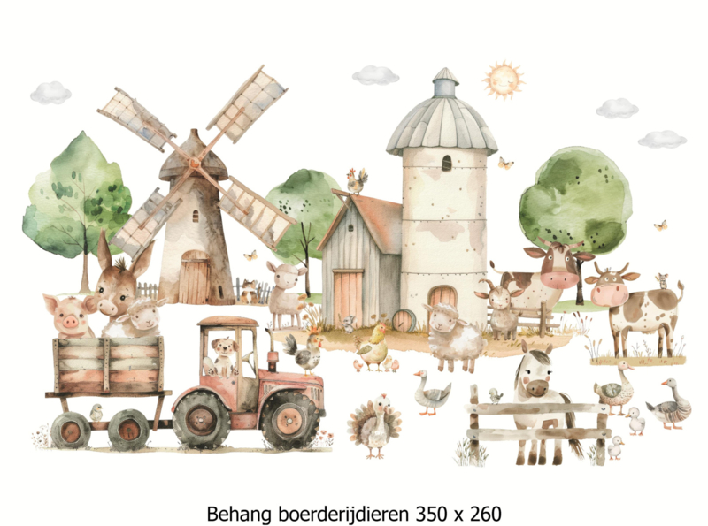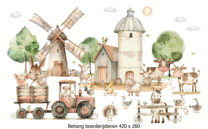 Breng het landelijke leven naar de kinderkamer met dit prachtige boerderijdieren behang. Het gedetailleerde ontwerp bevat allerlei schattige boerderijdieren zoals koeien, schapen, ezels, varkens en kippen, die allemaal in een speelse en vriendelijke stijl zijn weergegeven. De windmolen en het rustieke landschap maken de boerderijlook compleet.